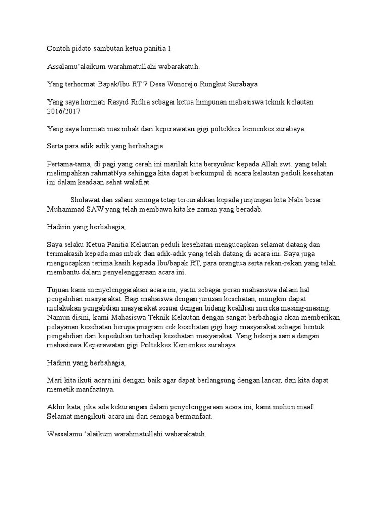 Contoh teks kata sambutan ketua panitia remaja mesjid . Sebelumnya, ketua panitia, rafika tarigan dalam laporannya menyampaikan perayaan natal 2021 kali ini, kami panitia dari pjj sektor simpang enam . Di bawah ini adalah contoh pidato sambutan ketua panitia natal sekolah yang bisa kami . Kata sambutan dari ketua panitia. Contoh kata sambutan untuk natal sekolah minggu.